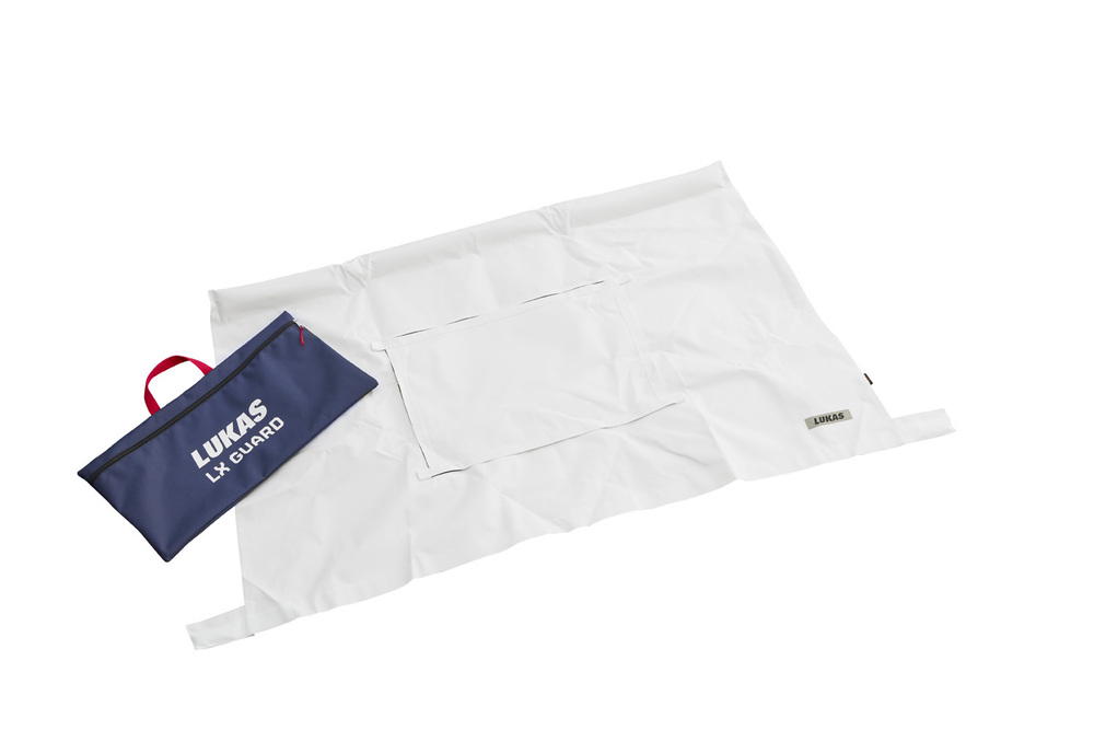La protection anti-éclats LUKAS LX GUARD se place derrière le pare-brise et protège les passagers du véhicule contre les éclats de verre lors du sciage de vitres lors d’interventions de secours routier. La bâche de protection peut soit être fixée au toit du véhicule à l’aide d’aimants, soit être maintenue en place à l’aide de bandes Velcro. L’extrémité inférieure, munie de mousse, est coincée entre le tableau de bord et le pare-brise. La LX Guard est dotée d’une fenêtre transparente au centre qui permet de surveiller les occupants du véhicule pendant l’intervention de sauvetage, mais qui peut aussi être fermée selon la situation.